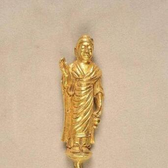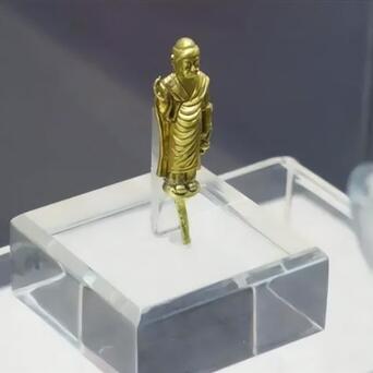 经过黑龙江省博物馆专家的仔细鉴定,这尊纯金锻造、重达49.3克的佛像,被确认为“唐代渤海国錾花立式金佛”。